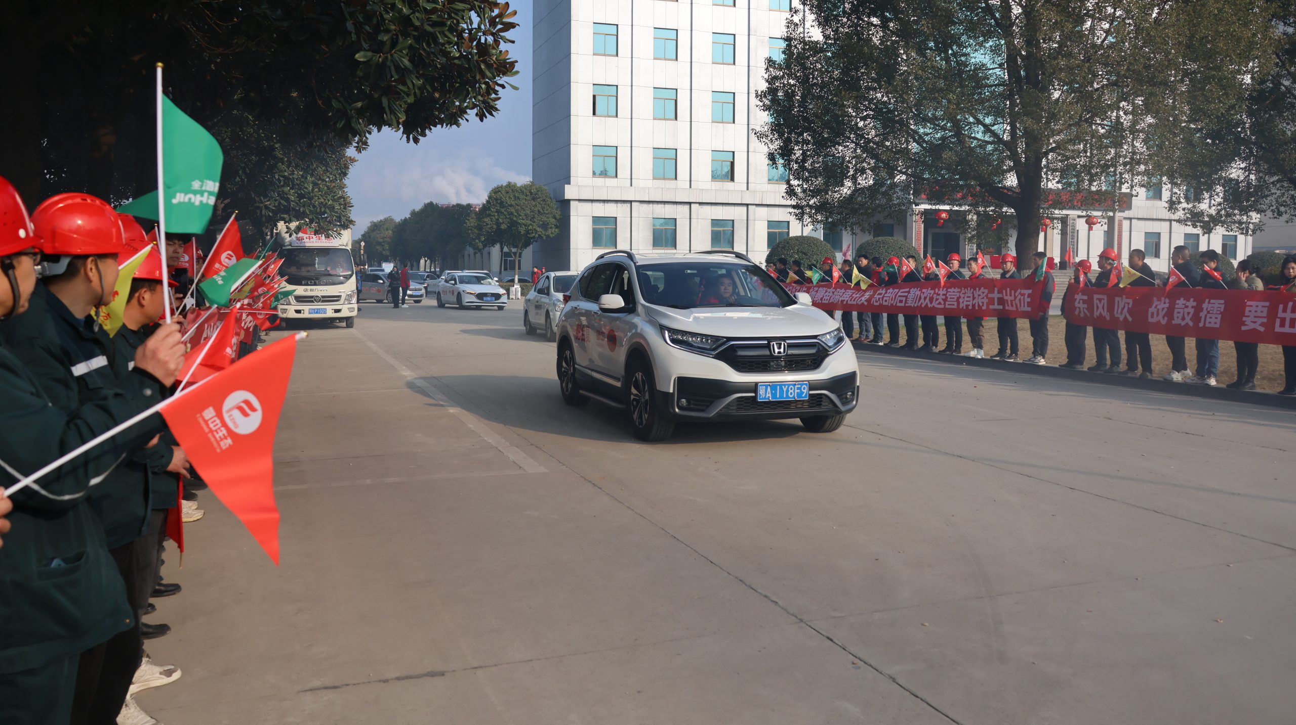 9點08分,隨著楊華登總經(jīng)理的一聲令下——出征,禮炮聲聲響徹大地,600余名營銷將士驅(qū)車奔赴全國市場,各部門負(fù)責(zé)人、一線員工及行管后勤人員手拉橫幅,揮舞彩旗,為即將奔赴全國市場一線的營銷將士們助威壯行,現(xiàn)場的掌聲與喝彩聲經(jīng)久不息。