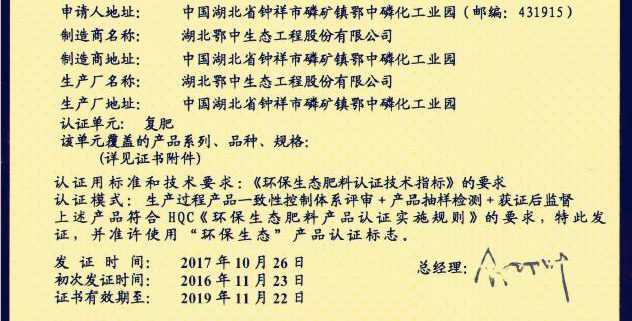 ?????? 專家組經(jīng)過綜合評審結(jié)論為,鄂中生態(tài)生產(chǎn)設(shè)備先進(jìn)、技術(shù)工藝嚴(yán)謹(jǐn),產(chǎn)品質(zhì)量可靠,復(fù)合肥料生產(chǎn)全過程均對有害物質(zhì)實施了有效控制,符合HQC《環(huán)保生態(tài)肥料產(chǎn)品認(rèn)證實施規(guī)則》的要求。在對產(chǎn)品進(jìn)行了抽樣封存,樣品寄到國家化肥質(zhì)檢中心檢測中,各項重金屬及縮二脲指標(biāo)均為合格。符合國家環(huán)保生態(tài)肥料產(chǎn)品的標(biāo)準(zhǔn)和要求,決定通過其環(huán)保生態(tài)肥料產(chǎn)品的認(rèn)證審核,授予其“國家環(huán)保生態(tài)肥料產(chǎn)品認(rèn)證企業(yè)”稱號。至此,鄂中生態(tài)已經(jīng)連續(xù)二年通過該項認(rèn)證。