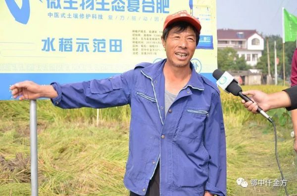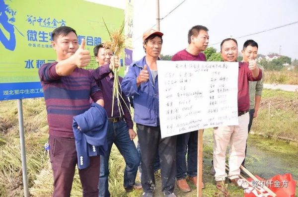 現(xiàn)場農(nóng)化專員分析說:“鄂中仟金方能改善作物的營養(yǎng)供應(yīng),特別是增加了有機質(zhì)、腐殖酸等有機營養(yǎng),有利于稻谷糖分的積累,提高了稻谷的蛋白質(zhì)和脂肪含量,解決了偏施化肥所造成的“菜不香、果不甜”的難題。施用鄂中仟金方可降低稻谷中的硝酸鹽含量,增加還原糖和維生素C的含量。同時仟金方施入土壤后,不僅給水稻生長提供所需的NPK和中微量元素,還能為作物提供有機質(zhì)和有益微生物活性菌群。有益微生物菌群在土壤中迅速繁殖,會產(chǎn)生多種對作物有益的代謝產(chǎn)物。這些代謝產(chǎn)物可刺激或調(diào)控水稻生長,使水稻健壯,達(dá)到增產(chǎn)目的。”