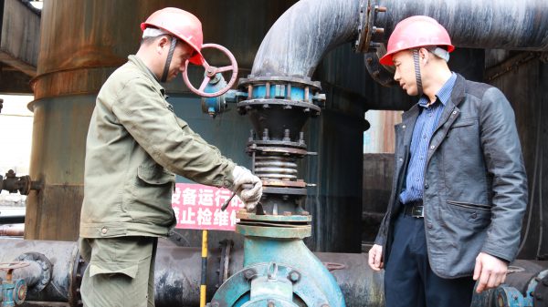圖為修理工在廠領(lǐng)導(dǎo)指導(dǎo)下對設(shè)備進(jìn)行維護(hù)保養(yǎng)?? (高中?? 攝)