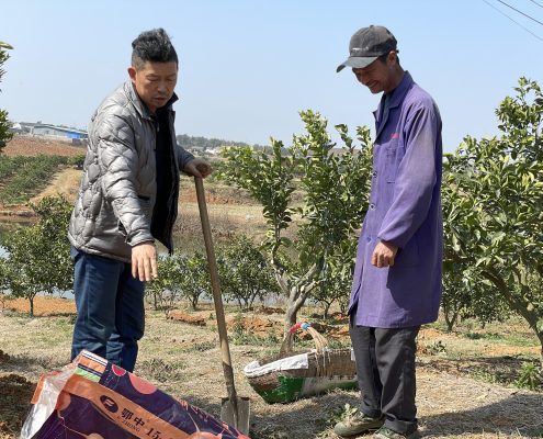 圖為何世勇(左)正在給柑農(nóng)示范施肥技術(shù)…