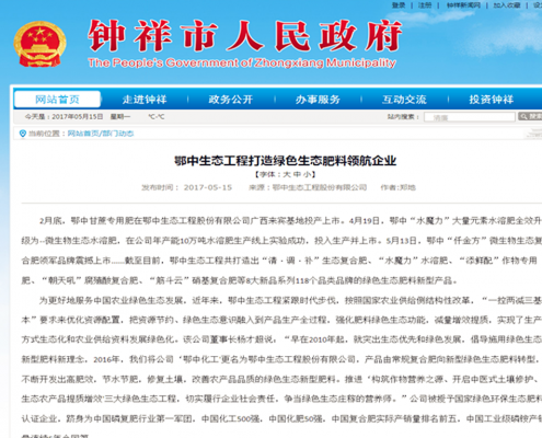 《農(nóng)資與市場》.《中國新型肥料網(wǎng)》.《鐘祥市政府網(wǎng)站》.《北方農(nóng)資》:鄂中生態(tài)工程打造綠色生態(tài)肥料領(lǐng)航企業(yè)